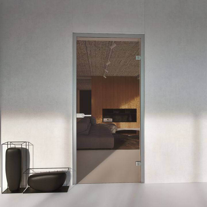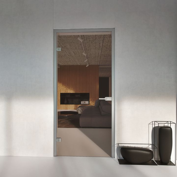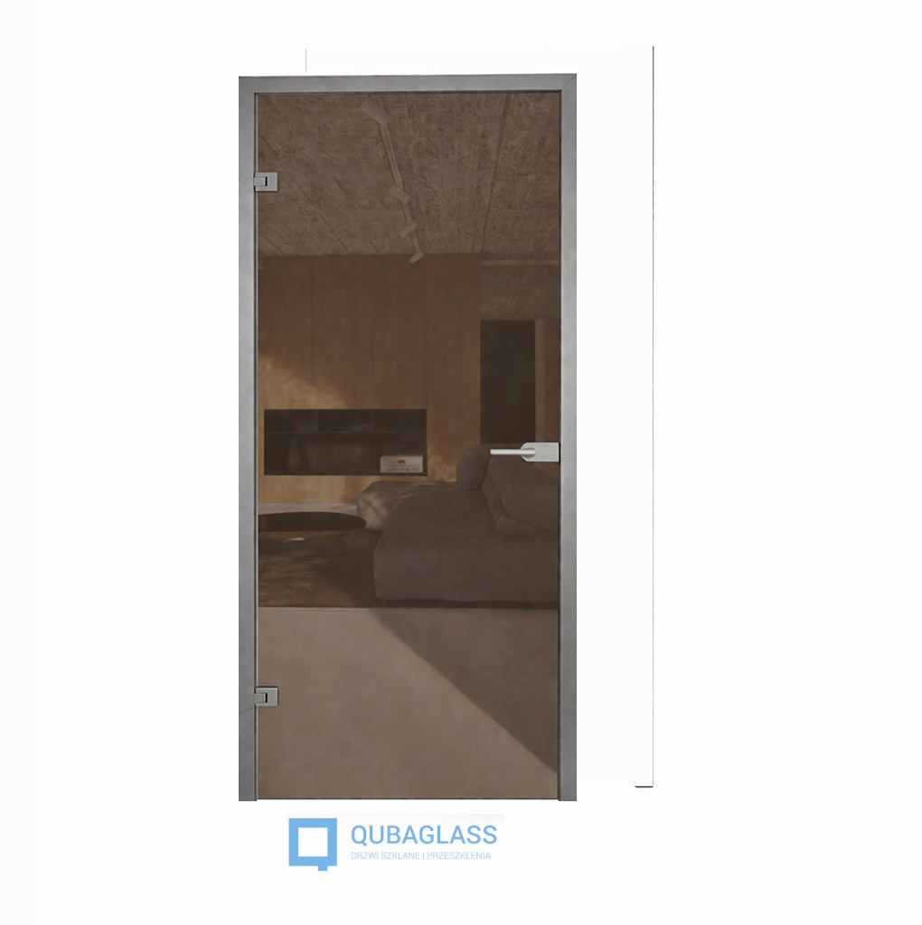 Opis - drzwi szklane otwierane do biura z ościeżnicą aluminiową brązowe przezroczyste