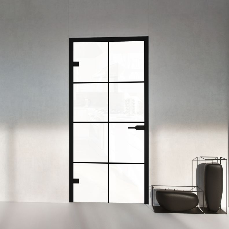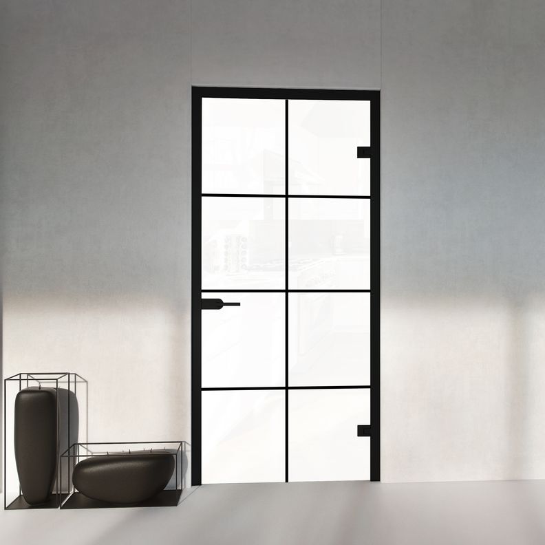 Opis - drzwi szklane otwierane do biura z ościeżnicą aluminiową loft szprosy czarna rama