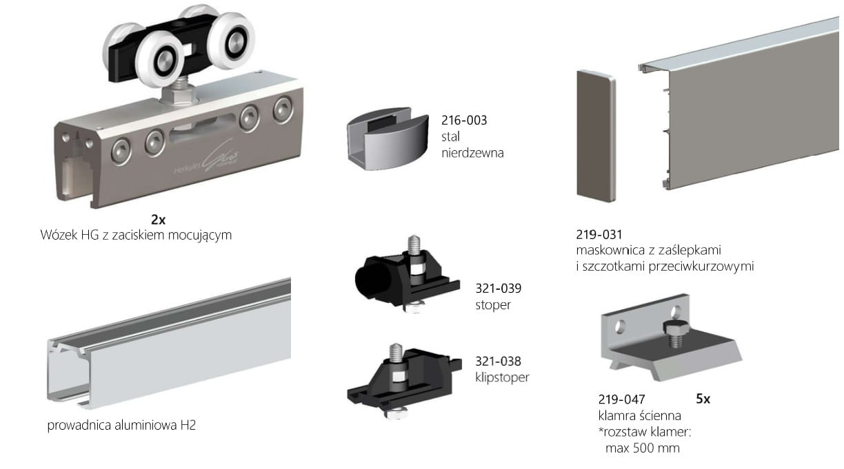 - komplet okuć montażowych DESIGN-LUX (wózki, hamulce, prowadnik dolny)